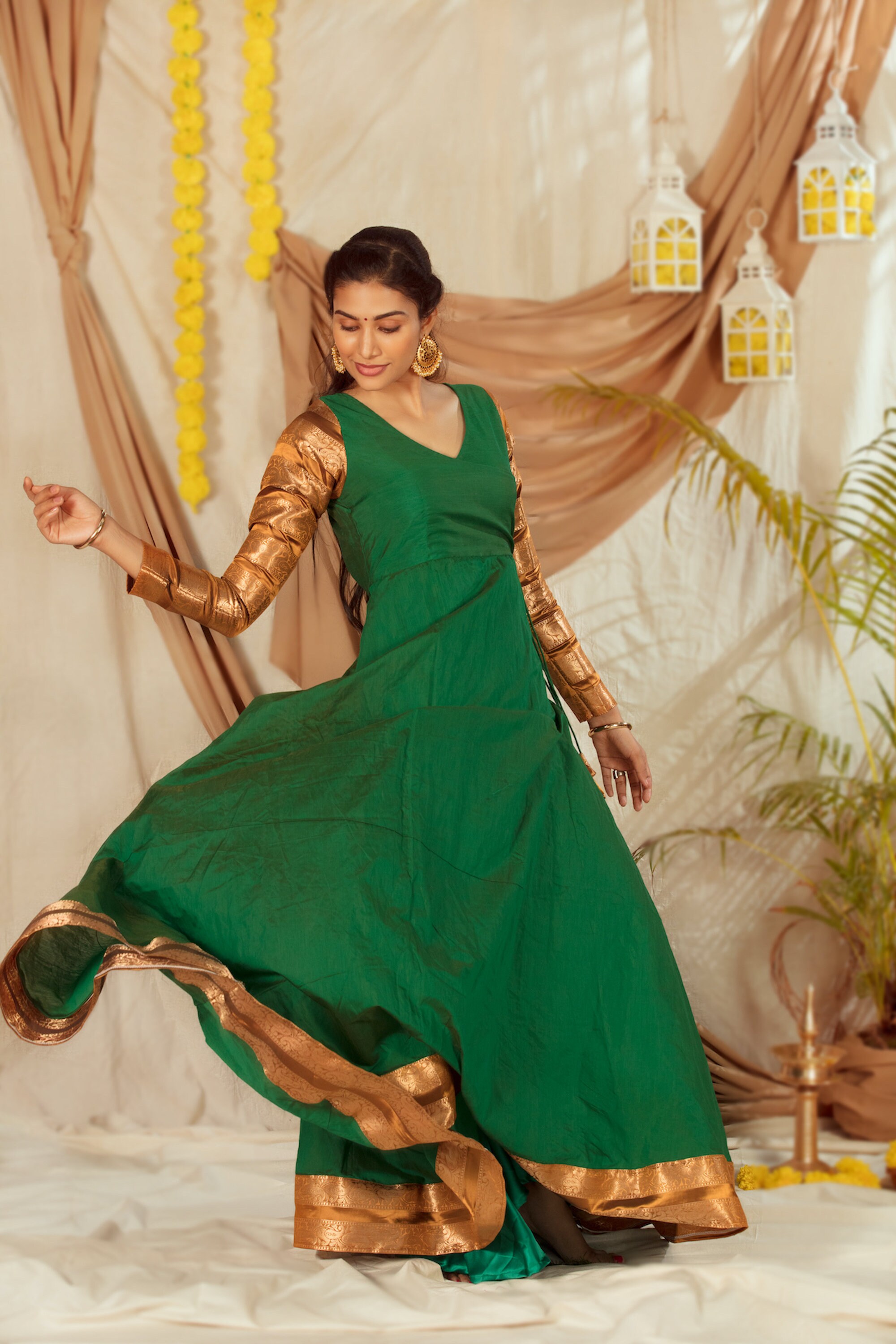 Bottle Green Chanderi Silk Anarkali Green Dress With Golden | Etsy